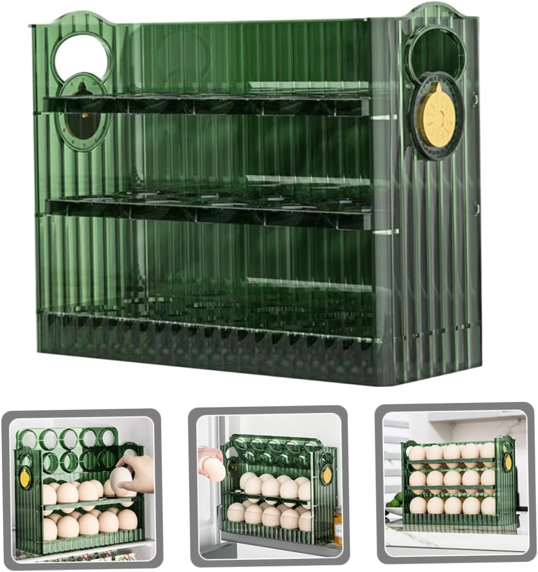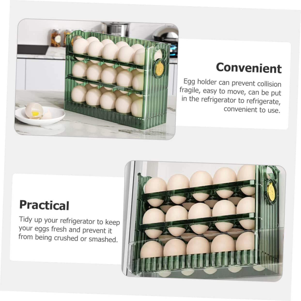 Package Include 2 x egg holder Characteristics - Color: Green egg storage -Material:Plastic egg holder - Size: 26.00X20.00X10.00cm/10.22X7.86X3 egg container for refrigerator. - Our refrigerator egg storage box is reliable and reusable, making them a great organizer in your kitchen egg storage holder. - Tidy up your refrigerator to keep your eggs fresh and prevent it from being crushed or smashed egg container. - The plastic egg holder is suitable for refrigerator, kitchen countertop, freezer, fridge, kitchen cabinets egg organizer for refrigerator. - The egg slot is suitable for egg storage and will not be damaged by rolling, unique and practical household egg storage rack. - Large capacity, the egg storage container can be placed many eggs in each layer for storage kitchen egg box.Goods Descriptionegg tray for refrigerator This is egg holder, which is made of premium plastic materials, durable and can be used for a long time.refridgerator/freezer organization It can be placed in refrigerator to keep eggs fresh.refrigerator organization Egg holder can prevent collision fragile, easy to move, can be put in the refrigerator to refrigerate, convenient to use
