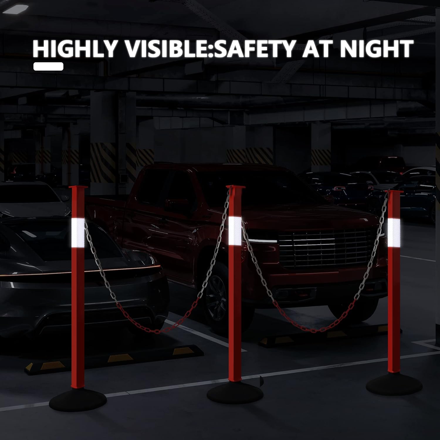 • [Eye-Catching Orange Color]: The bright orange color of the Parking Delineator Post makes it highly visible in any weather condition or lighting situation. Additionally, the post features 4 in reflective collars that reflect light and increase visibility, making it easy to see from a distance. white and 4FT red plastic chains can catch people's attention and take effect in warning people.