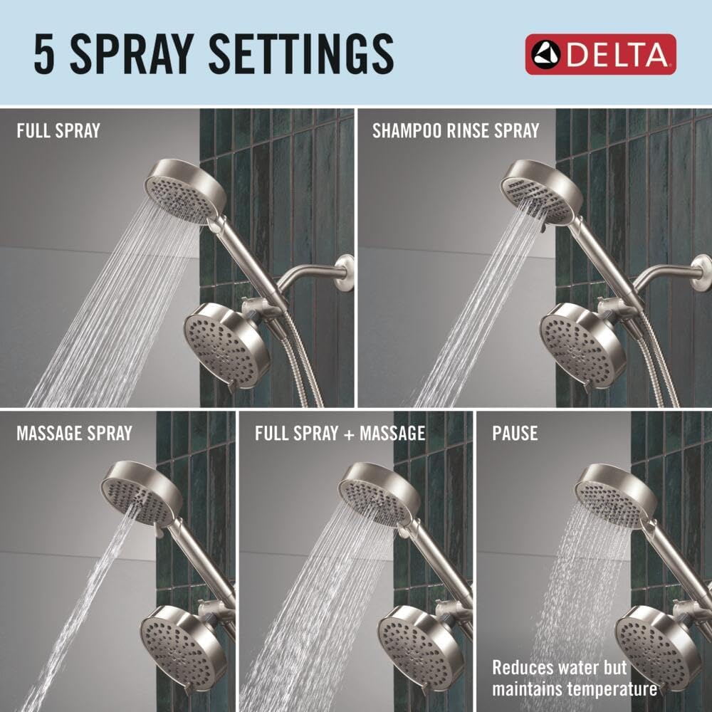 Experience versatility with the Delta® 2-in-1 Combination Shower. Featuring a shower head and hand shower, this design blends modern square designs with classic round curvatures for seamless style. Multiple spray settings deliver a personalized showering experience that elevates your daily routine with the perfect combination of functionality and versatility.