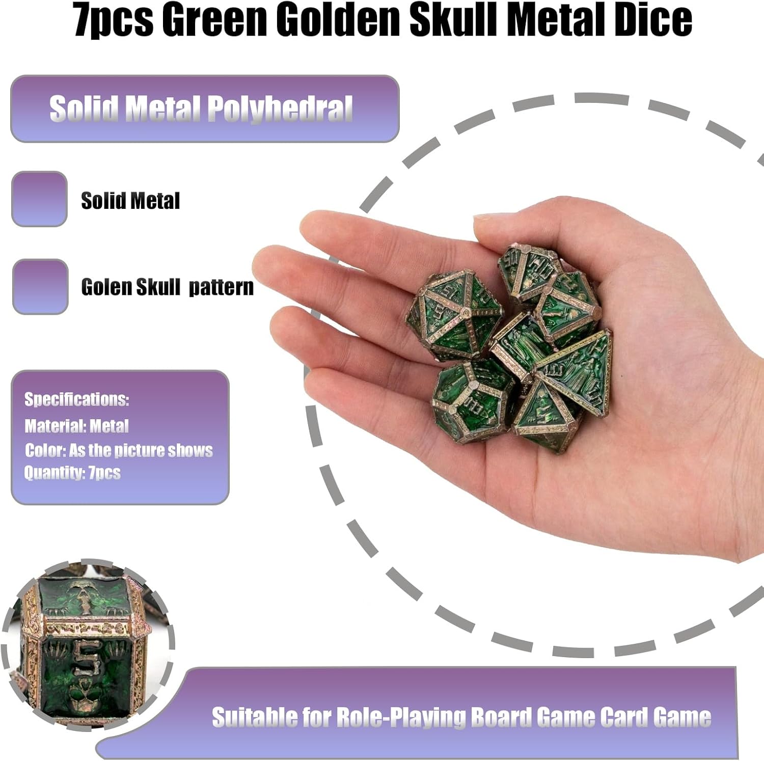 7pcs Skull Metal Dice, Solid Metal Polyhedral, Compatible with Role-Playing RPG Board Game Card Game(Green)