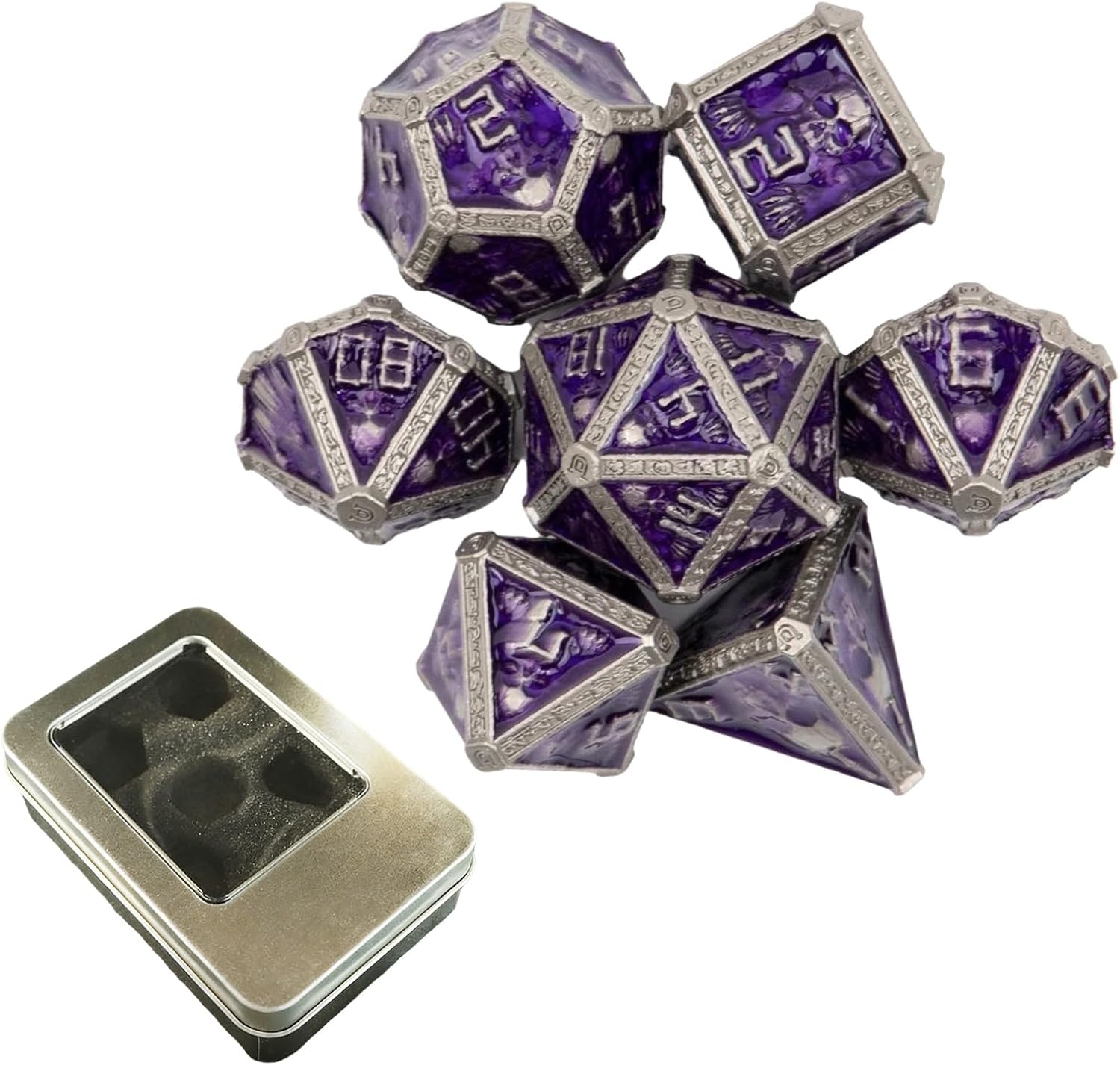 • 7-Die DND Dice Set - Package include 7 pcs dnd dice full set, there are D4 x 1, D6 x 1, D8 x 1, D10(0-9) x 1, D12 x 1, D20 x 1 and D%(00-90) x 1 violet metal