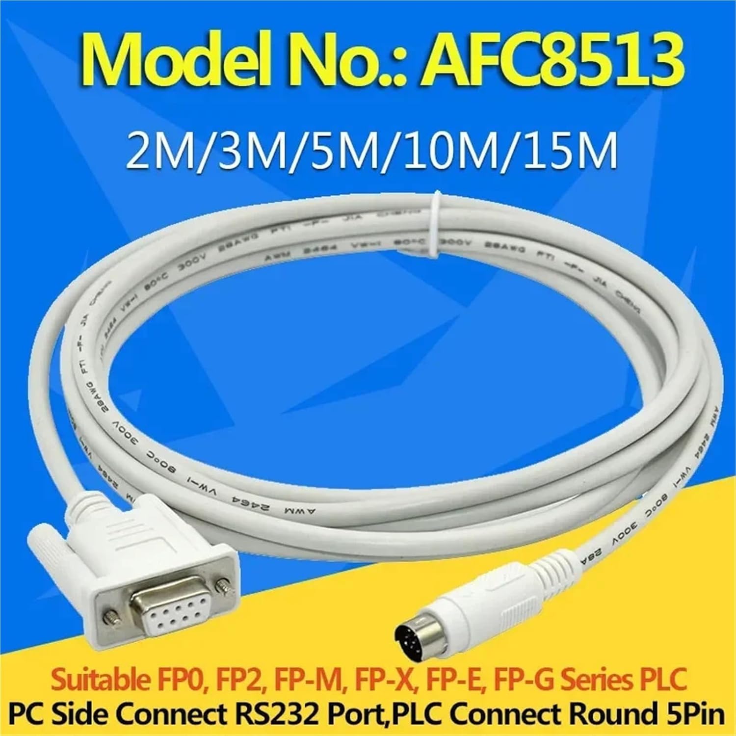 CablesModel: AFC8513Interface: Round 5pin male- 9pin FemaleCable Length:2m,3Meter,5m,10mPurpose: RS232 port cable, suitable Nail FP0,FP2,FP-M,FP-X,FP-E,FP-G Series PLC==========Model Number : AFC8513Application : Connect touch screenType : InsulatedConductor Type : StrandedConductor : CopperInsulation : PVC