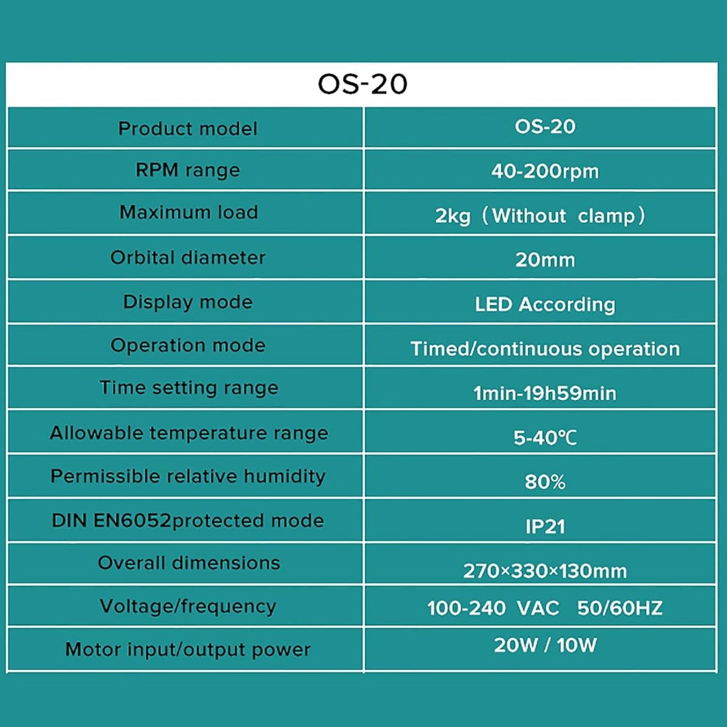 This compact digital orbital shaker has safety in mind with its over speed detection and protection. It has a wide time settings range from 1min to 19h59min with timer or continuous operation modes.The digital orbital shaker a speed range of 40-200rpm. It’s maximum load capacity with platform is 2kg and has an orbital diameter of 20mm.User Friendly ControlThis digital orbital shaker has two LCD displays for independent display of time and speed.SpecificationName:Orbital ShakerTray style: universal tray (25×25cm)Speed range: 40-200rpmOperation mode: ForwardMaximum load: 2kgDisplay: LED liquid crystal displayTiming: continuous/0-19 hours and 59 minutes timingMotor type: Carbon brush motorAllowable ambient temperature: 5-40°C (80%RH)Shell protection level: P21Package includes:1×Orbital Shaker1×universal tray1×power cord1×Instruction manualNote1.Due to manual measurement, please allow a deviation of 1-2mm.2.Please be aware that the product may have slight color difference due to display or other reasons.