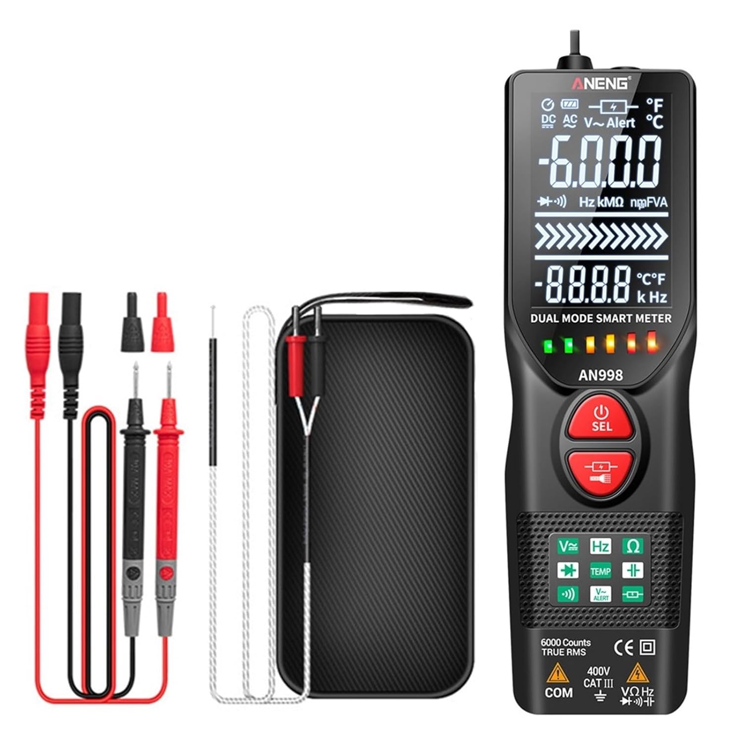 MultimetersAN998Dual-Mode 6000 Count Professional Multimetera.Description:The meter is a portable,professional measuring instrument,with digital display,and a backlight.Users can read the data easily.One-handed operation of the range switch facilitates measurement,with overload protection and low battery indication.Whether for the professionals,factories,schools,hobbyists and families,it is an ideal multifunction instrument.-The meter is for the AC Voltage,sine wave true RMS,duty cycle,resistance,capacitance,frequency ,measurement and firing line.diode test,temperature measurement.-Meter is with automatic range function.-Meter has a reading hold function.-Meter with automatic shutdown function.b.Technical Specification:FunctionRangeAccuracy Voltage6V+-(0.5% reading+5 digit)60V+-(0.5% reading+5 digit)400V+-(0.8% reading+5 digit)AC Voltage6V/60V+-(0.8% reading+3 digit)400V+-(1.0% reading+10 digit)Resistance600/6k/60k/600k+-(0.8% reading+3 digit)6M/20M+-(1.2% reading+3 digit)Capacity60nF/600nF/6uF/60uF/600uF/6mF+-(3.0% reading+5 digit)60mF+-(5.0% reading+5 digit)Frequency10Hz+-(0.8% reading+3 digit)100Hz+-(0.8% reading+3 digit)1kHz+-(0.8% reading+3 digit)FeatureDiode TestYesCircuit on-off TestYesLive Wall MeasurementYesTemperature0-300+-(1.0%+4d)301-1000+-(1.9%+5d)32-600+-(1.2%+6d)601-1832+-(1.9%+6d)c.Package:1*Multimeter1*Test lead wire1*Thermocouple1*Manual1*Storage bag1*Packing box==========Operating Mode : Auto/ManualMeasuring Capacitance Range : 60nF/600nF/6uF/60uF/600uF/6mF/60mFOperating Temperature : 0 - 40 DIY Supplies : ELECTRICALMeasuring Resistance Range : 600/6k/60k/600k/6M/20MModel Number : AN998 Digital MultimeterMeasuring Inductance Range : 10Hz/100Hz/1kHzDimensions : 152*42.4*23mm Current : MultimeterAC Current : MultimeterAC Voltage : 6V/60V/400V Voltage : 6V/60V/400VDisplay Type : Digital display Model : AN998
