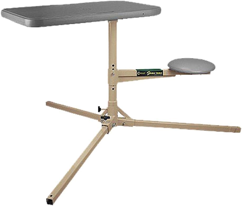 The Stable Table is purpose-built to be the finest value-priced shooting bench in the market. Its design is more rigid and has fewer joints than folding-style benches and is appropriate for a wider variety of shooting conditions and disciplines. A bolt in the base allows position adjustment of a single leg, aligning the tabletop so that it is parallel with the horizon. The central shaft, seat and tabletop are able to pivot around a center axis as a single unit while keeping the tabletop parallel to the horizon. This allow the user to make shots at any angle from a single setup - ideal for varmint hunting. The bench can easily be locked into a single shooting position if desired. Its table top is made from molded plastic with a rigid metal under-frame. The top measures 34" x 23" and it includes holes that function as handles for easy transport or as holders for the included cleaning forks as well as a perimeter rail that keeps ammunition from rolling off the bench top. The entire frame is made from welded steel. The padded seat adjusts from 16" to 22" and rotates in tandem with the tabletop.