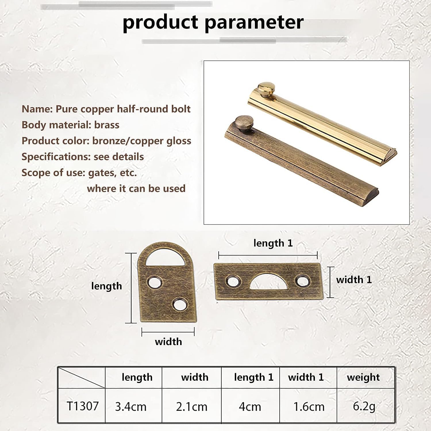 Widely Used Without WorryingSuitable for doors, cabinets, bathrooms, toilets, windows, furniture, pet doors, etc. Don't worry about splashing the bathroom door because it won't rust.Own Your Private SpaceWhen you don't want to be disturbed, 5 minutes of DIY by hand, this easy to install Slide Latch Lock can let you enjoy the comfortable time of a person.Ensure the of GoodsDon't worry about mischievous and lovely children and lively pets. When you don't pay attention, they will eat up all the snacks and smash the fragile things on the ground.This surface bolt is constructed from extruded solid brass with a bright polished finish. This bolt can be used as a secondary lock for entry doors or for numerous other applications.Name: Pure copper half-round boltBody material: brassProduct color: bronze/copper glossSpecifications: see detailsScope of use: gates, etc.where it can be used