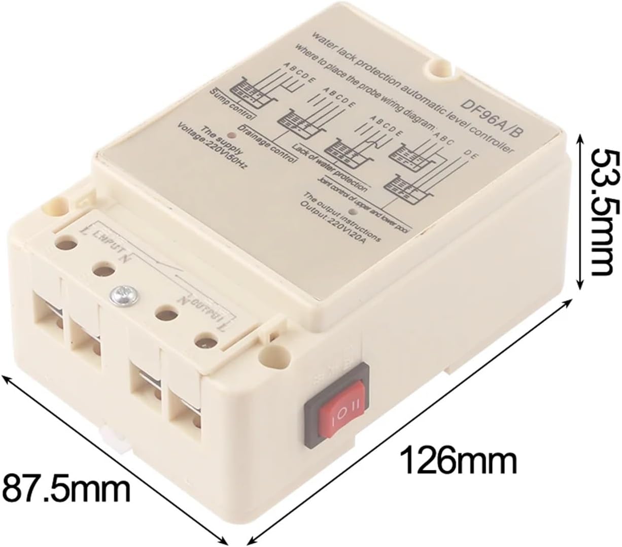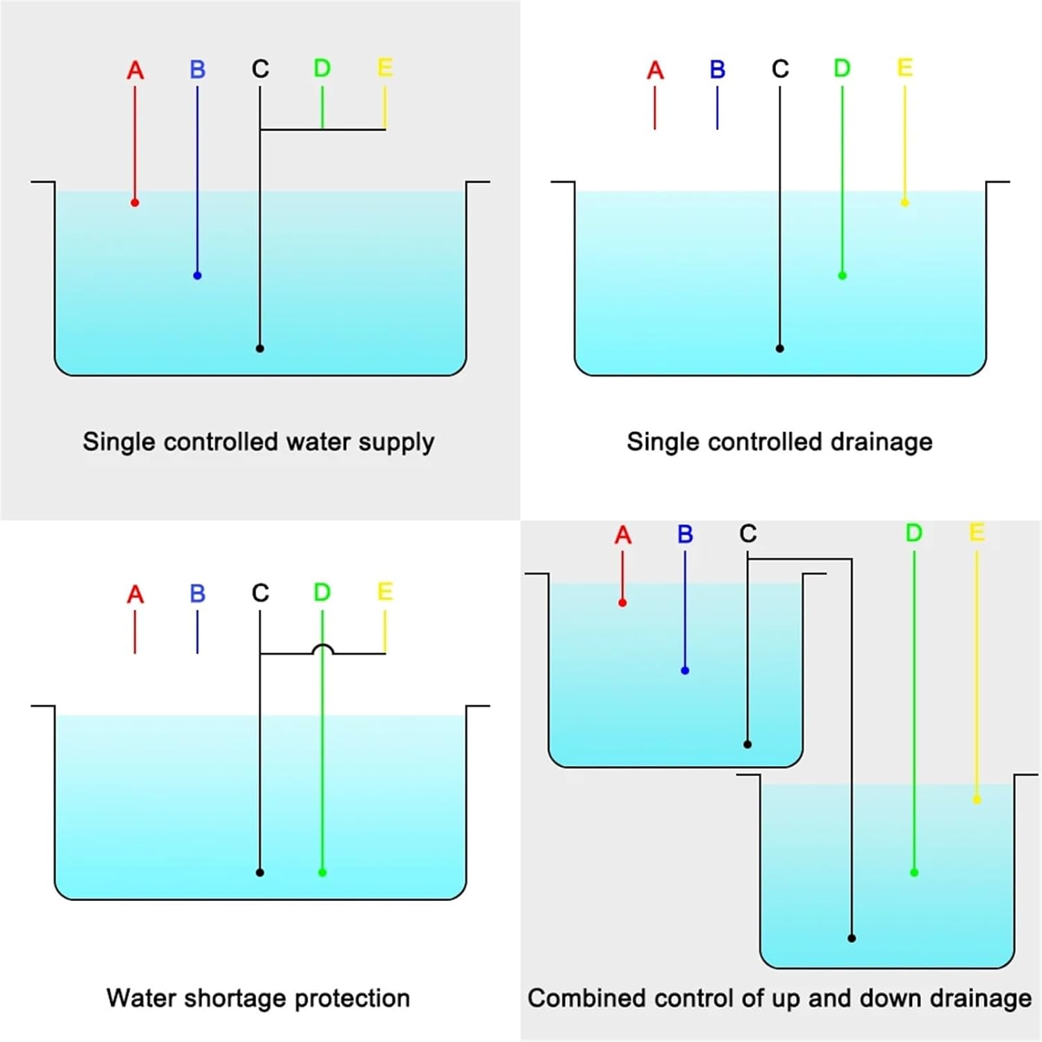 Water PumpsWater Level Controller Switch Single-control UP pool (water storage) installation instructions shown in figure 1A(red)-Upper water level control point. When water level gets to A point,the probe touch water and controller can stop the pump by auto.B(blue)-Lower water level control point. When water level gets off B point,the probe out of water and controller can start the pump by auto.C(black)-Should be placed in bottom of pool as the common line.D(green) and E(yellow)are connected with C (black).Single-control DOWN pool(drain water)installation instructions shown in figure 2.E-Upper water level control point. When water level gets to E point,the probe touch water and controller can start the pump by auto.D-Lower water level control point. As liquid level gets off D point,the probe out of water and controller can stop the pump by auto.C-Should be placed in bottom of pool as the common line.A&Bdisconnected1 Lack of water protection installation instructions shown in figure 3C&DLower water level control points When water level gets off this pointC or D probe out of water and controller can stop the pump by auto.E&Cshortconnected;A&Bdisconnected2 Joint control UP and DOWN pool installation instructions shown in figure 4A-Upper water level control point in UP pool. When water level gets to A point,the probe touch water and controller can stop the pump by auto.B-Lower water level control point in UP pool. When water level gets off A point, the probe out of water and controller can start the pump by auto.C-Should be placed in bottom of UP and DOWN pools as the common line.D-Lower water level control point in DOWN pool. When water level gets off D point, the probe out of and controller can stop the pump by auto.E-Upper water level control point in DOWN pool. When water level gets to E point, the probe water and controller can start the pump by auto. Then pool starts to drain water. If not, E point disconnectedUsed to solve problem:1. On power but no work:a. Check the red indicator is on or not. If not, make the connection is good enough;2. When water level is above or below probes but the pump does not start or stop by auto, Please check it like the following.a. Whether the probe is placed too high or low so that water level can or out of it;b. The connection of upper &lower line or probe is dislocation by error or short connected;c. To check the probe whether it is rust or not or the connection is good enough.d. C- Check the common line whether it is placed in the lowermost bottom of pool.