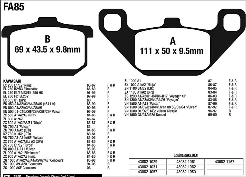 EBC Brakes Organic OE quality replacement motorcycle brake pads are manufactured in the UK using high technology ECO friendly brake pad compounds that deliver fingertip stopping power.With over 40 million sets sold worldwide, the E327 grade organic compound has been a high selling EBC product for over 15 years and is suitable for all road bikes and scooters.These organic brake pads are now ECE R 90 brake safety test approved and fully TV tested. Motorrad Magzine based in Germany rated EBC Brakes Organic OE Quality Replacement Motorcycle Brake Pads as being a high quality organic brake pad and they are even now proven suitable as a sintered pad replacement.All EBC Organic brake pads now incorporate backing plates which are patented with the Nucap NRS hook retention system. This guarantees zero chance of brake pad de-bonding with corrosion or extended use. These brake pads are not for track or race use.Superior streetbike brake pad100% ECO friendlyCan be used to replace organic or sinteredECE R 90 approved and TVtestedBenefit from low disc abrasion and dustBRAKE PADS ARE SOLD IN PAIRS, ONE PAIR OF PADS PER EACH CALIPER.