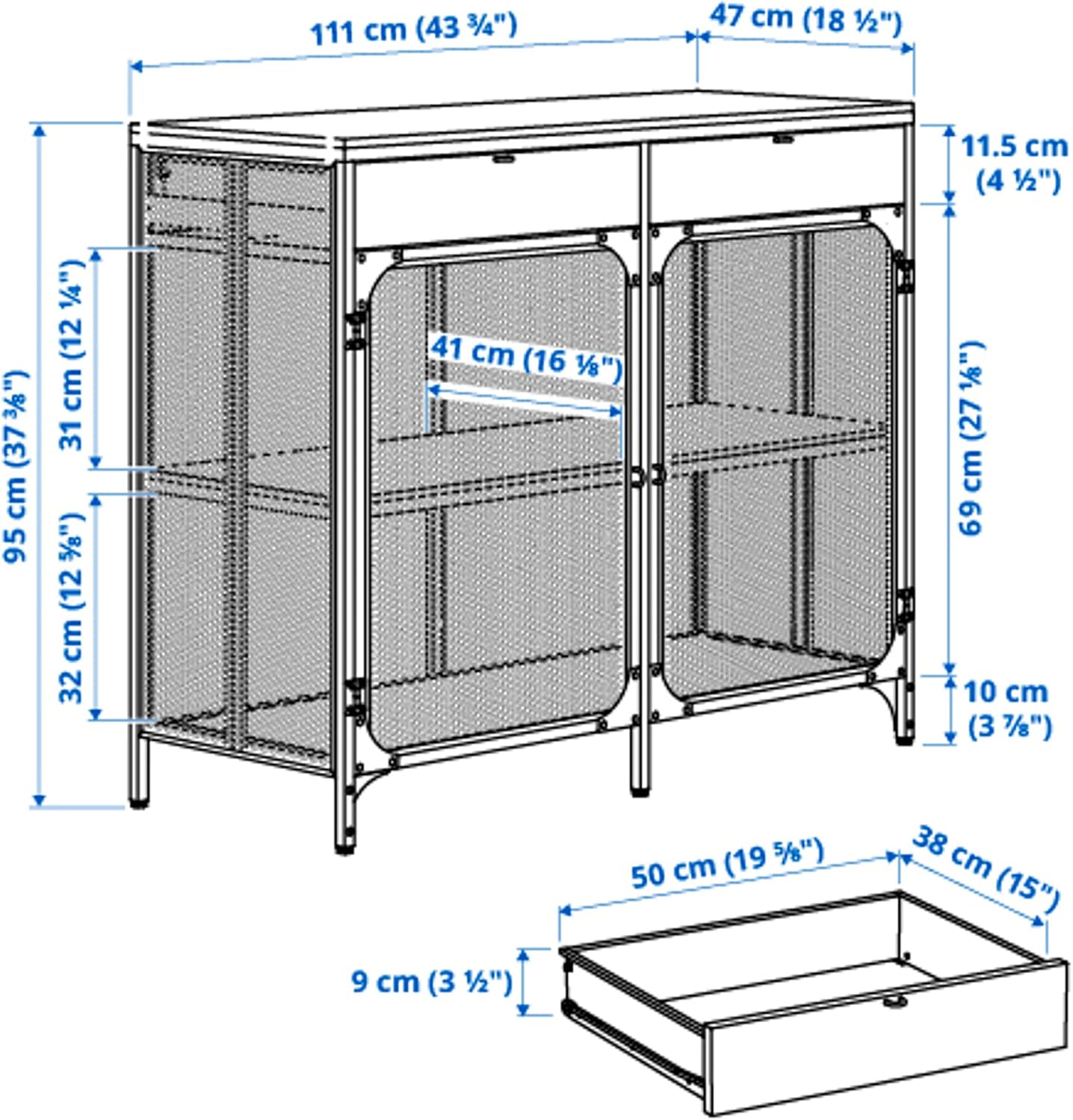 Key Features:A sideboard gives you plenty of space to store things and a surface to create an attractive display - or to unload serving dishes while you eat. Add cutlery trays and storage boxes to your sideboard to make it easier to keep your dining area organised. Place your favourite objects on display on top of the sideboard and hide items that tend to clutter in the drawers or behind doors.Assembled Size:Depth: 47 cmHeight: 95 cmWidth: 111 cmWidth of drawer (inside): 50 cmDepth of drawer (inside): 38 cmImportant note: For customers ordering from outside of EU, please note, you may be subject to import duty and tax. Please check with your postal or tax office on your import regulations
