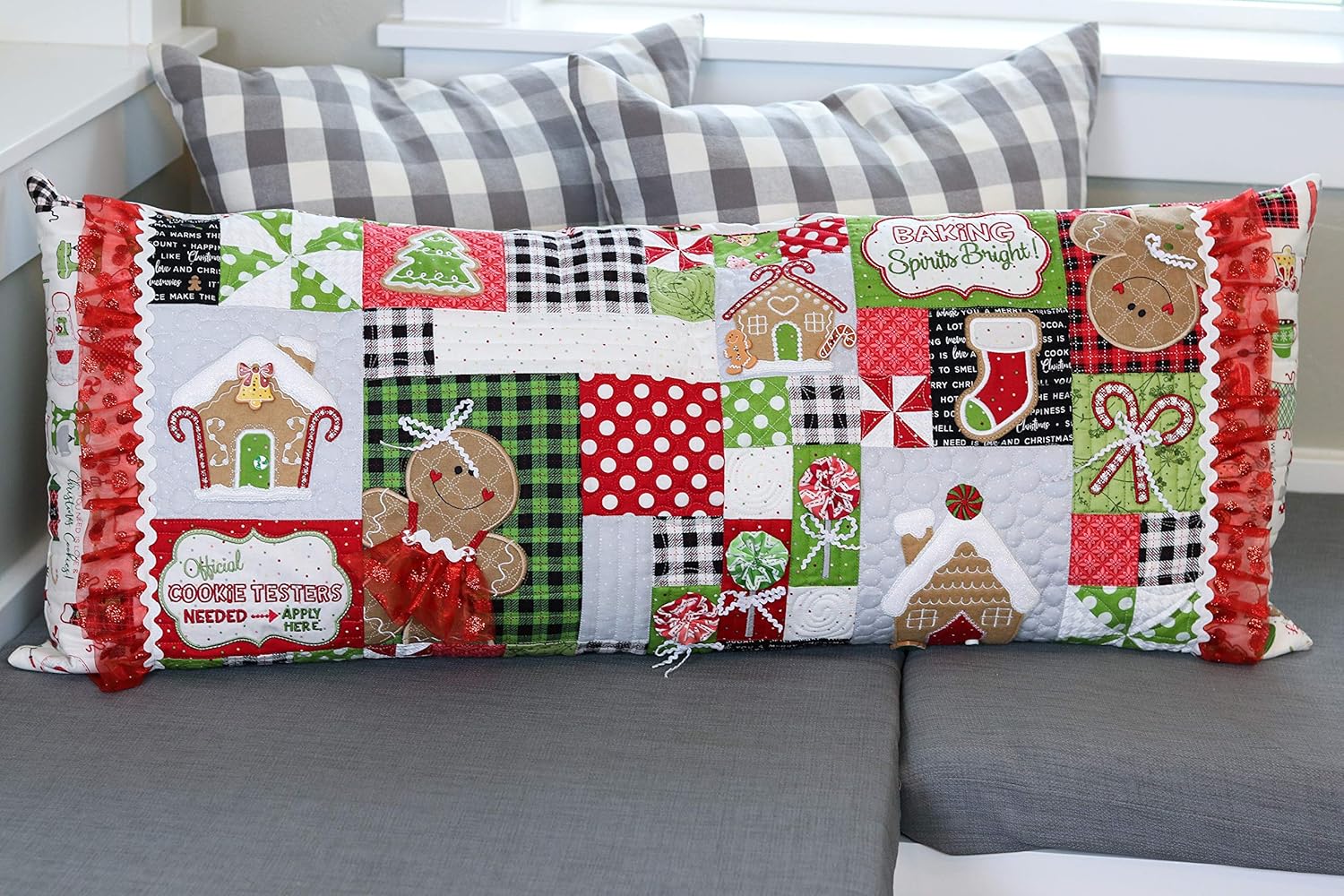 Kimberbell Embroidery Machine Christmas Pillow - "Ginger's Kitchen" Bench Pillow Template for Christmas Decorations, Machine Embroidery Winter Decor, Arts & Crafts Embroidery Patterns on CD Welcome to your "Ginger's Kitchen" Christmas throw pillow bench kit! Now you can machine embroider Kimberbell’s popular series of interchangeable pillow covers! Start by making one large bench pillow form. Then change out a new cover for that pillow form each holiday season! This Christmas, your "Ginger's Kitchen" pillow will be "baking spirits bright" with candy canes, gingerbread, and peppermint lollies galore! With seasonal quilting, fringed wreaths, dimensional Christmas buttons and more, these Christmas pillow covers are the merriest way to deck your halls with the most savory of Christmas throw pillows. This is the jolly embroidery pillow kit your holidays have always wanted with all the Christmas embellishments and candy cane decor you could imagine! Your embroidery hoops have been waiting for our Kimberbell kits to experience the joy of creativity. Files formats include: ART, DST, EXP, HUS, JEF, PES, VIP, VP3, and XXX Bonus “SVG” files are included for use with your personal electronic cutting machine. At Kimberbell, art for adults is our passion, and we strive to help people feel the joy of creativity by providing superior quilting, embroidery and sewing machine experiences. We have carefully curated a wide selection of quilting and sewing machine with embroidery designs, and we provide easy to follow step-by-step instructions so you can get the most out of your embroidery project, making Kimberbell the place to go for any sewing kit for adults and quilt kits for beginners. Add a variety of Kimberbellishments for sparkle and shine to your machine embroidery designs.