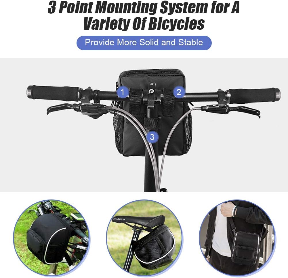 Description: The bag is mounted by means of three straps; Two are fastened around the vertical handlebar and the middle third fastened around the horizontal bar; The device succeeds easily and with proper cultivation (straps pull relatively tight) is no longer slipping possible and there are no rattling noises to hear; Also keep the hook and loop fasteners at full load bombproof; In the small side pockets fit e.g. the sunglasses, handkerchiefs, keychain or similar small parts; The frame bag is and wear-resistant; Zip and reflective stripes, comfortable to open or close and safer while cycling at night; straps for quick release and installation, suitable for a variety of Features: 1.Bike storage frame bag is made of high quality material, waterproof, wear-resistant and comfortable 2.Large capacity, where you can store some items, repair tools and so on 3.Design with 3 straps for quick release and installation, suitable for a variety of ; Can be attached to the front of the or under the pillow and can also be used as a belt pouch 4. Reflective strips, provide a warning effect for night riding to avoid accident, keep your night ride safety 5. This handlebar bag is suitable for all kind of bikes --Mountain ,Scooter,Road ,Kids ,commute city ,etc Specifications: Pocket material: 1680D polyester Color: Black Package weight: approx. 145 g Size: about 12 x 11 x 16 cm / 4.72 "x 4.33" x 6.29 " Package Included: 1 x front bag 1 x rain cover