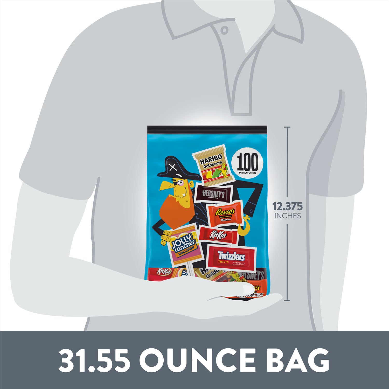 Enjoy a delicious chocolatey or fruity treat anywhere and anytime with Hershey assorted milk chocolate and fruit flavored candy in a variety bag. Offering six crowd pleasing favorites, this candy assortment is perfect for sharing with family, friends and Halloween night visitors. Take this bulk variety candy bag into the office break room, pour some individually wrapped candies into your jar at home or take a bag to your next costume party to make an impression. This variety bag includes TWIZZLERS Twists strawberry flavored chewy candy, KIT KAT milk chocolate wafer candy bars, HARIBO GOLDBEARS gummies, JOLLY RANCHER lollipops, HERSHEY'S milk chocolate candy bars, and REESE'S milk chocolate peanut butter cups candy.