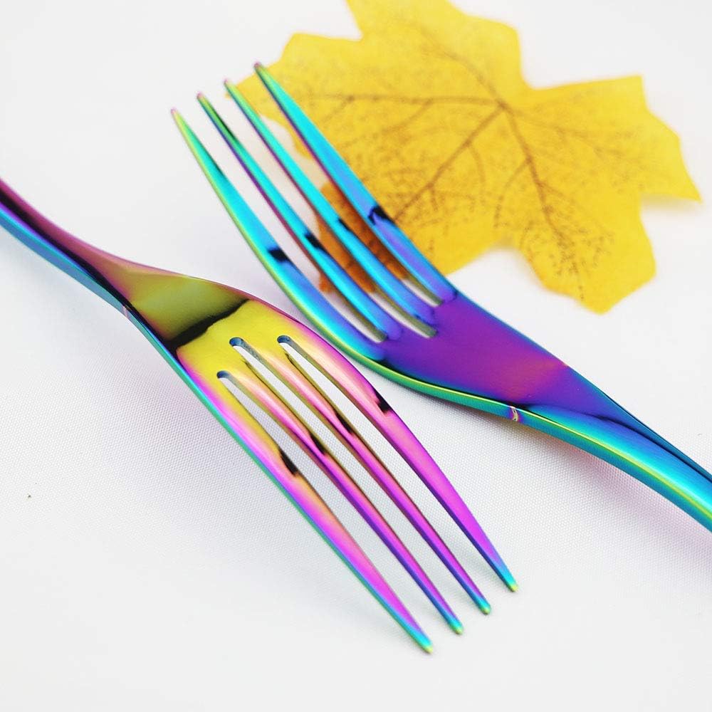 Perfect Thickness and Weight Made of high quality stainless steel for longevity. The design is simple and practical and suitable for everyday use, Let you enjoy a pleasant meal time. Best gift for kitchenware Suitable for Birthday, Valentine's Day, Wedding, Mother's Day, Christmas, Thanksgiving and other parties - order cutlery sets - This will be the most useful gift!. Luxury mirror polish requires no re-polishing.Luxury polishing mirror makes it bright, fashion and elegant. Specifications: Material: Stainless Steel Prouduct name:Flatware Set Pattern: Solid Color:Rainbow Design: Mirror Polish Style: Luxury Chic Modern Package includes: 4* Dinner Knife 4* Dinner Spoon 4* Dinner Fork 4* Dessert fork 4* Teaspoon Crafted from quality stainless steel Strong and durable for long time Highly polished and shiny Classic design, goes well with your table setting Perfect weight and comfortable to use Dishwasher safe for easy cleanup Everyday use, party, catering, wedding, holiday meal Notice: 1.Please wash the flatware set with warm soapy water before first using 2.Please dry the flatware set with soft towel timely. 3.The color may have slight different due to monitor difference. 4.If you have any problem, please free to contact with us.