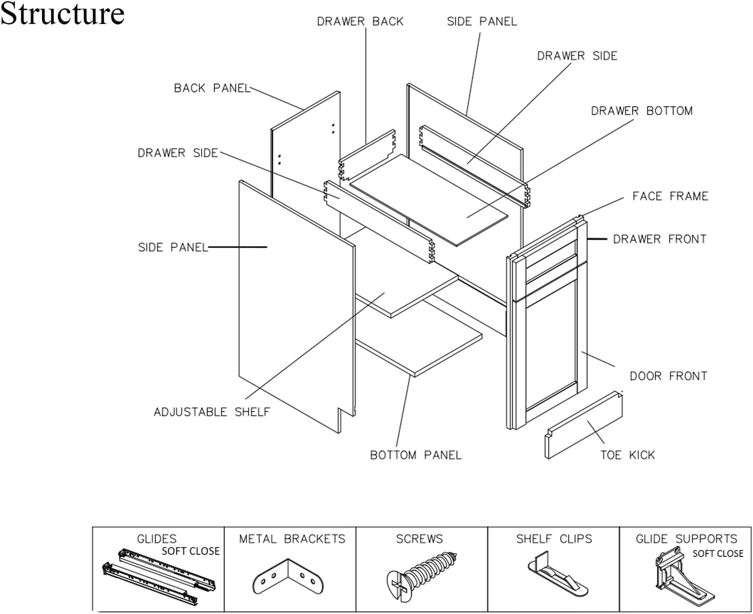 Included Components Door Hinges, Drawer Glides, Metal Bracket, Screws, Shelf and Shelf Holders