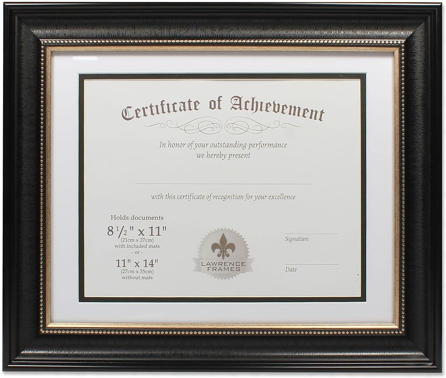 Traditional bronze and burnished gold document frame with delicate beading. High quality composite frame is perfect for any document, sports photo, award, or special picture. Comes with black backing suitable for wall mounting only. Hanging hardware already installed for vertical or horizontal wall display.