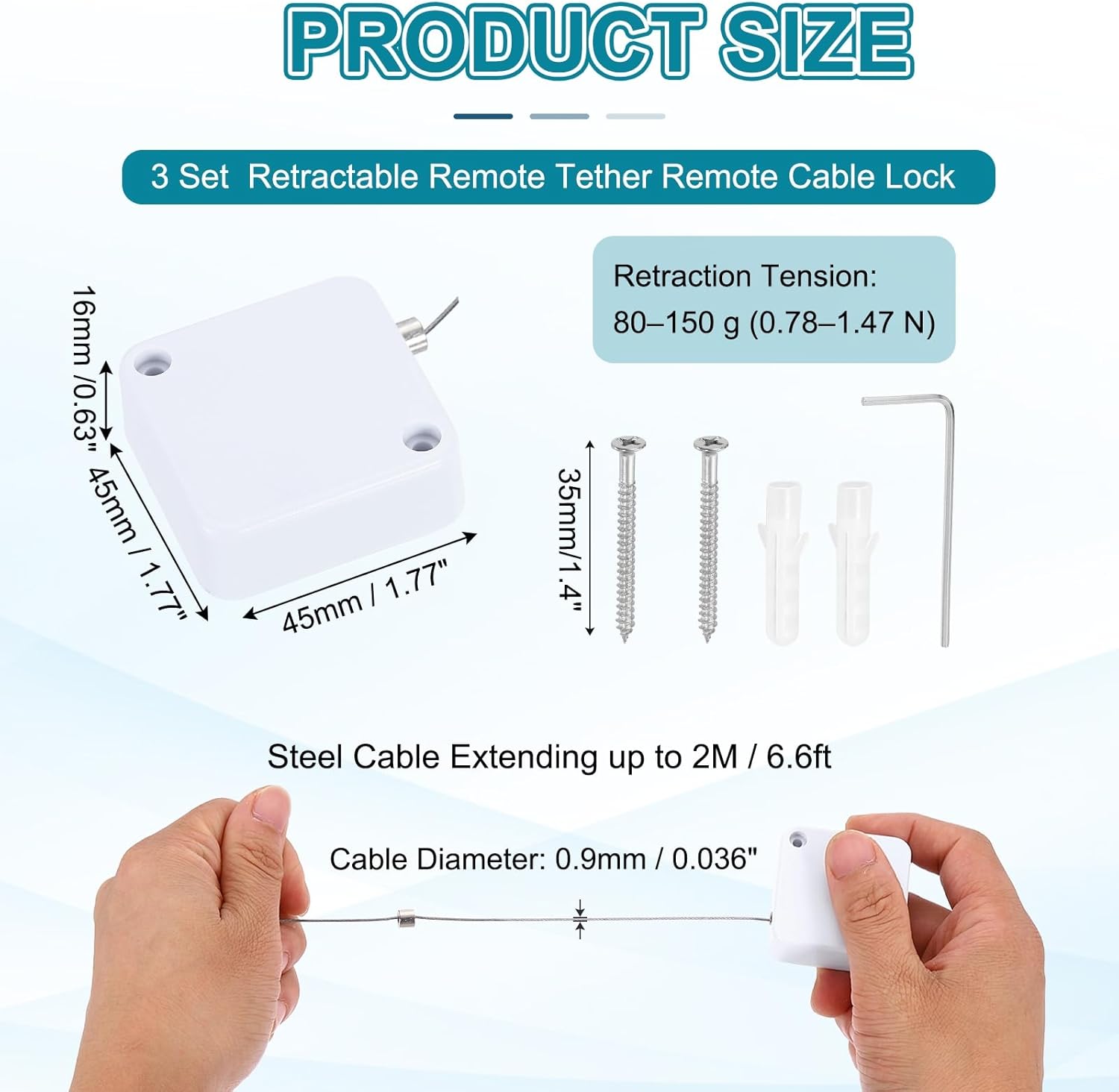 Reasons for selection:Our Remote Cable Lock has a base made of ABS, which is lightweight and impact-resistant, and a cable made of 304 stainless steel constructed from 49-strand steel wire, which is known for its corrosion resistance, tensile strength and durability—all combining to ensure the lock's long-lasting performance and reliable, secure use in diverse scenarios.Measurement:Steel Cable Extending up to 2 metre / 6.6ft / 78.7 inch; Base size: 45 x 45 x 16mm / 1.77 x 1.77 x 0.63 inch(L*W*H); Cable diameter: 0.9mm / 0.04 inch; Retraction Tension: 80–150 g (0.78–1.47 N); Color: White; Package: 3 Pcs Pull Box, 3 Pcs Hex Key Wrench, 6 Pcs x M3x30mm Screws, 6 Pcs x Plastic Wall AnchorsSuitable for:This retractable remote control cable tether is expertly designed to prevent theft of phones, tablets, TVs and other electronics in public or shared environments. It is widely applicable to diverse scenarios including retail displays, offices, homes, watch shops, 3D movie theaters, optical shops, jewelry stores, digital stores, large supermarkets.Installation:This retractable remote control cable tether comes with an adhesive patch for stable mounting and an adjustable copper column (use the included wrench to set the device-to-base distance). For a more permanent, sturdy install, you can also fix it with the supplied screws and plastic wall anchors. Easy to use: Adjust the strap loop with the enclosed wrench to fit your device and lock it in place. Then mount the base, which has a rear adhesive pad, to any flat surface to prevent lossKind tips:Ensure the mounting surface is clean and dry before application. After attaching the base, avoid pulling or stretching the tether for at least 3 hours to allow the adhesive to fully set and form a firm, long-lasting bond.