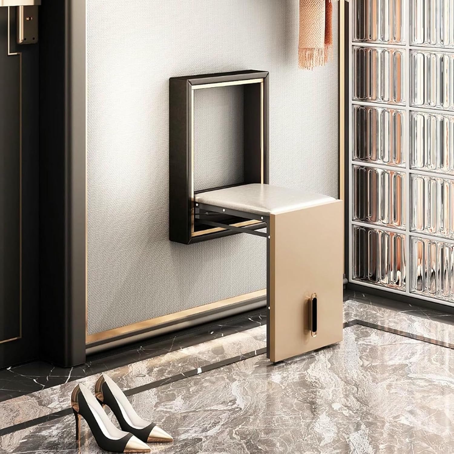 Product DescriptionProduct name:wall-mounted folding stool/Foldable wall stoolcolor:Multiple colors to choose fromMaterial: Carbon steel bracket+rubber wood frame+PU leather foam cushionFolded size:30x45x7cmExpanded size:30x72cmSitting height: 40cmSuitable for: doorways, corridors, restaurants