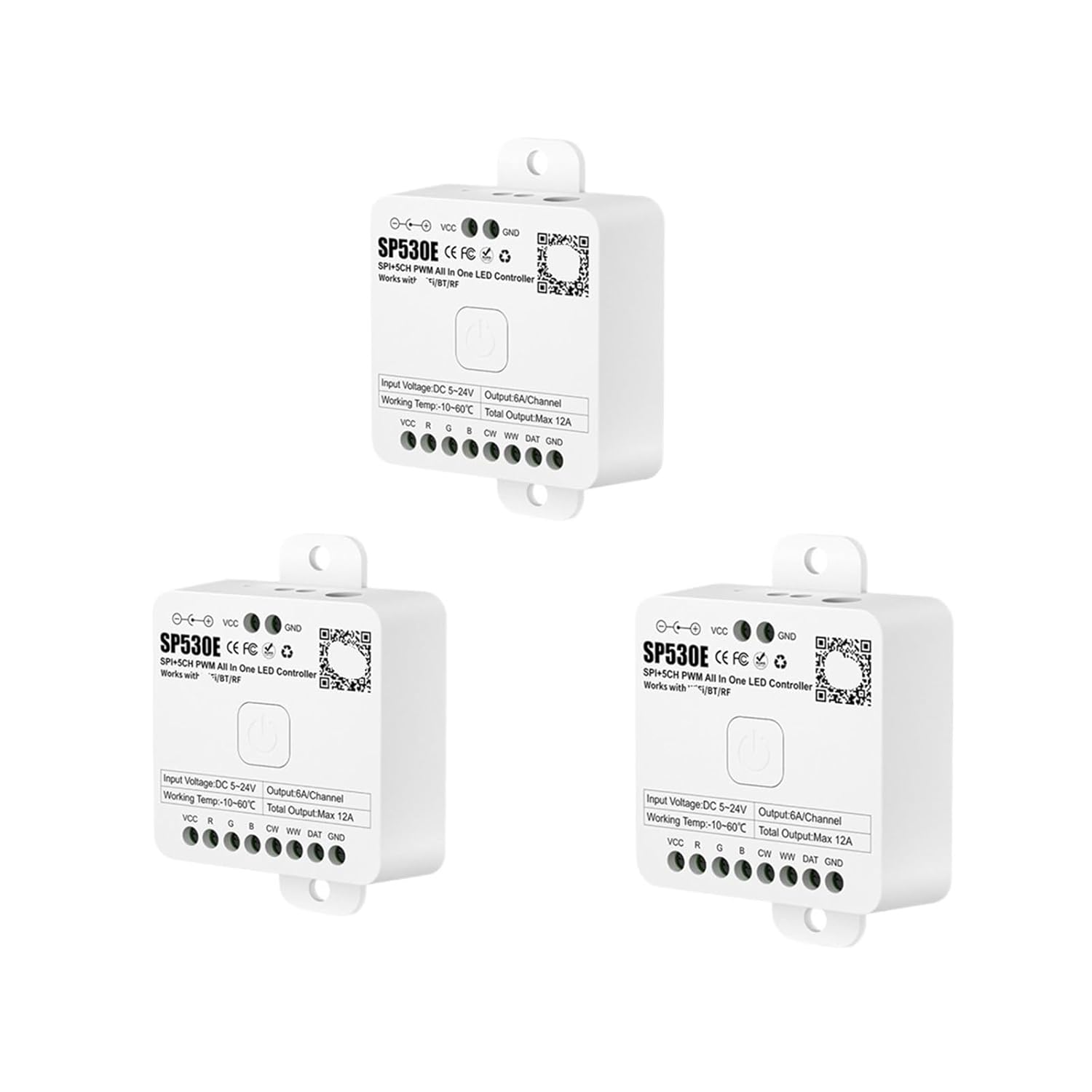 Outlet & Switch CombosSPI CCT/RGB maximum pixels 1200/1800SPI RGBW Max pixels 900SPI RGBCCT maximum pixels 600/720SPI RGB+1CH PWM monochrome MAX Pixcel 1200SPI RGB+2CH PWM correlated color temperature maximum pixels 1200describe:feature:Supports multiple control methods - control, speaker voice command control, 2.4G remote control, providing flexible usage!Upgraded music effects - multi-segment LED light strip music effects and LED music spectrum effects can provide you with more music spectrum effects! You can DIY the music and lighting effects you want.Multiple music collection methods - supports multiple music collection methods such as mobile phone microphone, player streaming, onboard microphone, etc.More powerful functions - supports power on and off dynamic effect , timer , interesting power on and off trigger , and default power on state .12 different types of LEDs --- Compatible with up to 12 different types of LEDs.2. Using capacitive touch IC, it has high sensitivity, good consistency and strong reliability.3. Support one-to-many control, one remote control can control multiple controllers.4. Supports many-to-one control, each controller can be bound to up to 5 remote controls.5. Support unified control and 4 partition control.Technical parameters:SP530EWorking voltage: DC5V~24VWorking current: 20mA~85mAPWM single channel maximum output current: 6APWM total maximum output current: 12AWorking temperature: -10℃~60℃Size: 78*56*20mm2.4G remote control/panelWorking voltage: 3V (CR2032)Quiescent current: 36AFrequency: 2.4GHzRemote control range: 30MRemote control size: 135*48*10mmPanel size: 86*86*12mmPackage Included:SP530E:1*color box1*SP530E LED controller1*screwdriver1*Manual2.4G touch remote control/panel (depending on the model you purchased)1*color box1*2.4G remote control/panel1*2.4G remote control/panel manual1*Sticker (86 type panel only)=========Model: SP530ECertification: CCC, CE, ROHS, ULMaterial: plasticPeriod: 1 yearmaximum. Load power: 6AOrigin: Mainland ChinaProduct Type: DimmerType: LED controllerAmperage: 6AInstallation area: indoorLED string/light bar type: WS2811 WS2812Voltage: DC5V-24VFeatures: SPI+5CH PWN ALL INFeature 2: Support 2.4G controlFeature 3: Multi-segment LED lights with music effectsFeature 4: Voice controlFeature 5: ControlFeature 6: Application Control