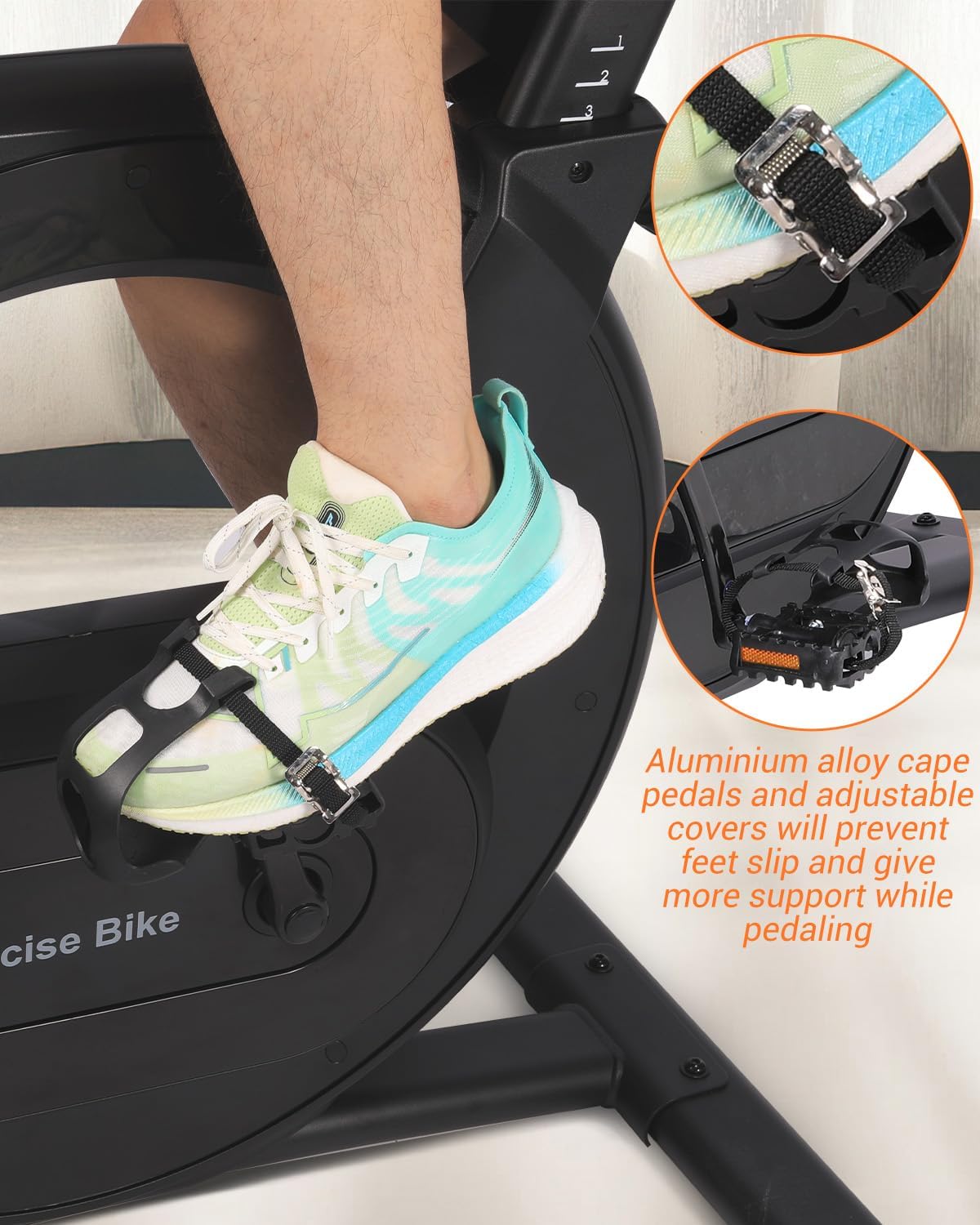 Product Description【PROFESSIONAL-GRADE MAGNETIC RESISTANCE】 Experience studio-quality cycling at home with the exercise bike. Featuring 32 precise magnetic resistance levels controlled by a smart shuttle knob, this stationary bike offers a smooth, quiet ride perfect for apartments and family homes. With a robust 300 lbs weight capacity, it’s designed to support users of all fitness levels.【IMMERSIVE SMART WORKOUT EXPERIENCE】 Connect via Smart Workout to access exclusive training apps and virtual cycling classes. Track your performance in real-time with the clear LED monitor that displays time, speed, distance, and calories burned.【COMFORT ENGINEERED FOR LONG RIDES】7-Way Adjustable Seat: Height and horizontal position (0-2 inches) can be customized for optimal comfortEnhanced Stability: Unique snail-style carbon steel frame ensures rock-solid performance during intense workoutsMulti-Grip Handlebars provide versatile riding positions for varied training routines【PREMIUM BUILD & HOME GYM READY】 Constructed with heavy-duty carbon steel and premium components, this indoor cycling bike delivers the durability and reliability you expect from premium home gym equipmentTechnical Specifications:Resistance: 32-Level Magnetic ControlMax User Weight: 300 lbsDrive System: Advanced Belt DriveFrame: Reinforced Carbon Steel