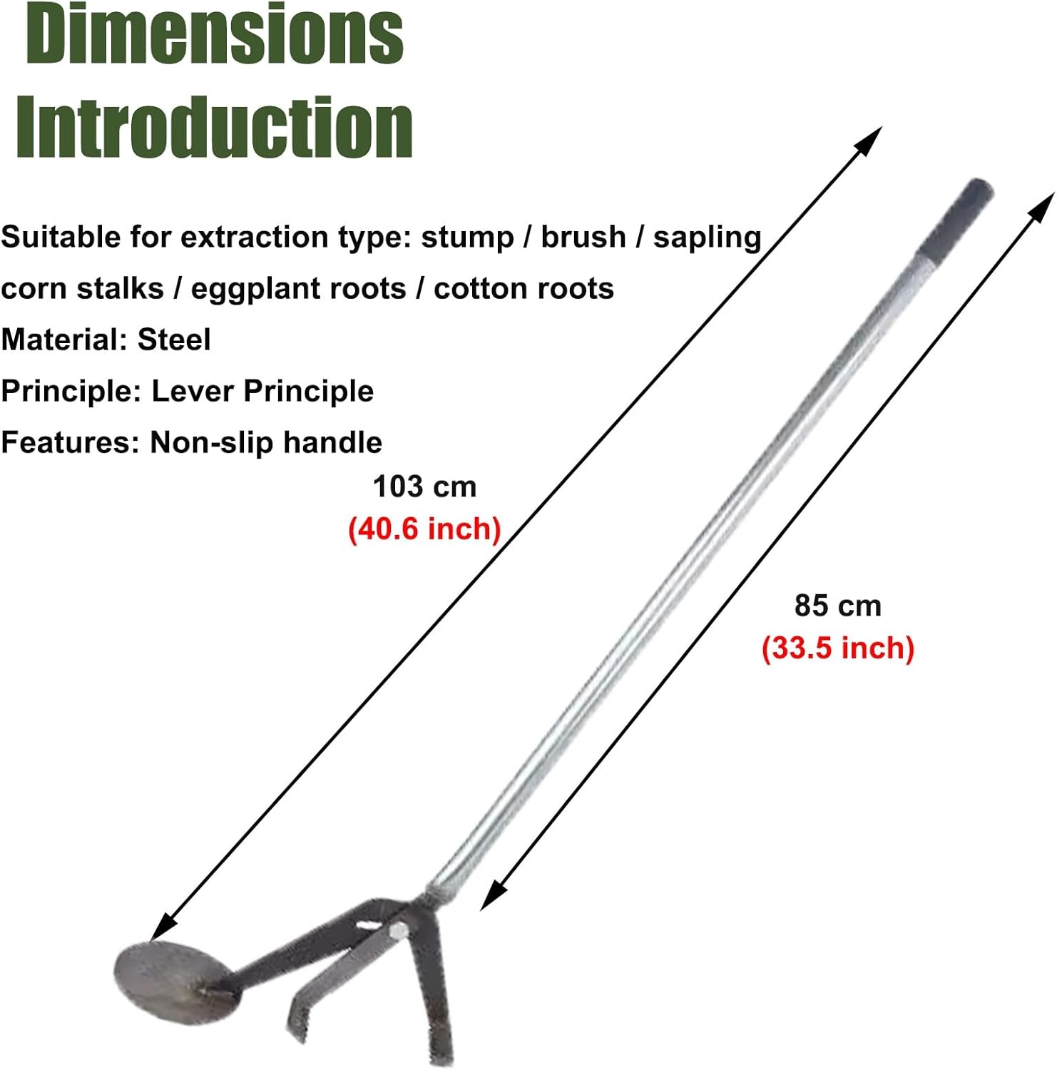 Have you ever struggled with old stump posts buried deep, digging with a shovel until your arms ache yet the post won't budgeTry our post-puller tool—just position it at the base, gently press the lever, and the post pops right out!It saves time and effort, and you'll never have to pay someone else to do it again!❉Package Include :- 1 x Post Puller❉Specifications:- Material: Steel- Principle: Lever principle- Features: Non-slip handle- Pole Lengt: 85 cm (33.5 inch)- Total Length: 103 cm (40.6 inch)- Pole Diameter: 3.3 cm (1.3 inch)- For safely remove: stump/brush/sapling/corn stalks/eggplant roots/cotton roots❉Feature :- Head adjustment with automatic size recognition.- The end features a non-slip texture to prevent slipping out of your hand.- Metal construction, suitable for long-term outdoor use.- Leverage mechanisms not only save effort but also save time.- Simple to operate, even those with limited strength can use it.❉Note :- There may be some 5 - 6 mm errors in manual measurement, please refer to the actual product.- Colors might slightly vary due to the shoot lights and on different monitors and screens, please refer to the objects received.