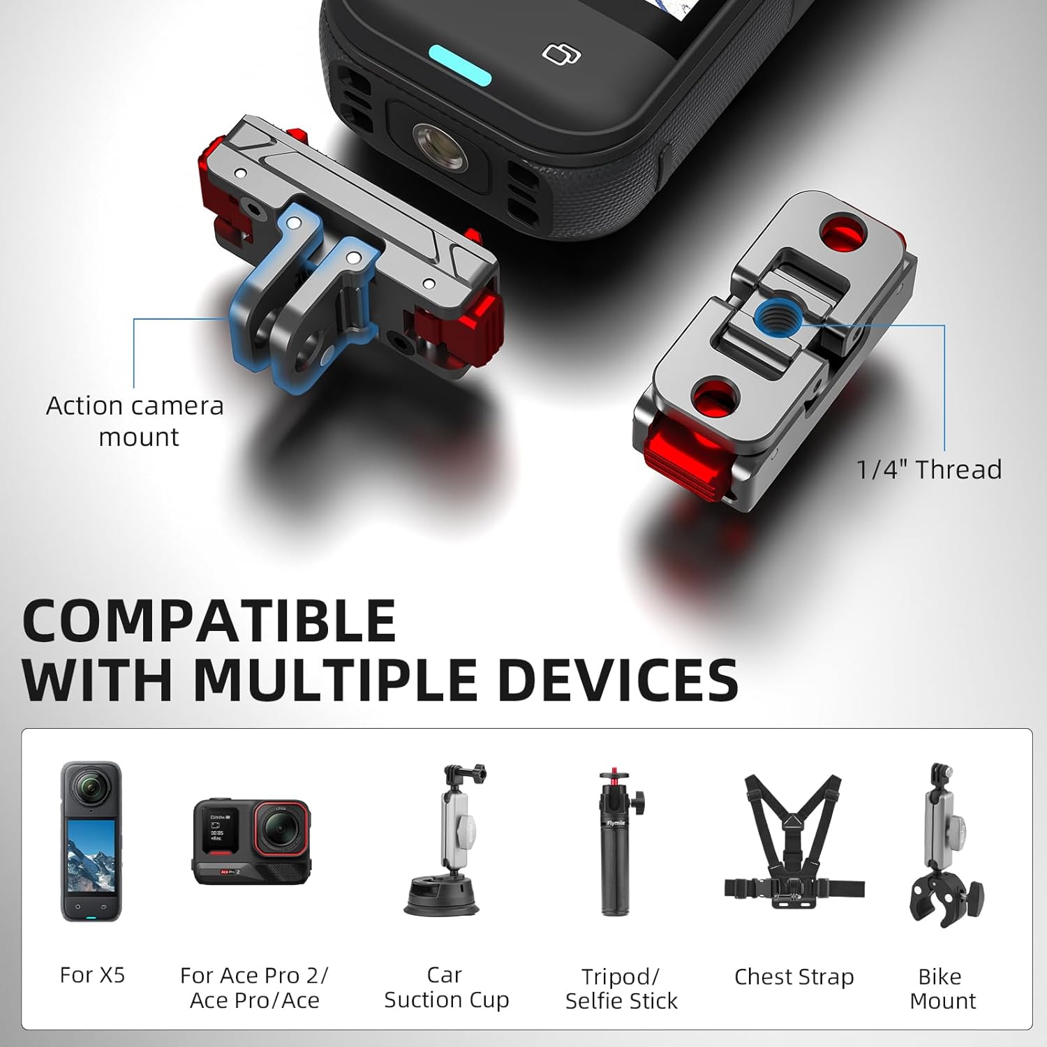 • 2. Premium Material: The Insta 360 Ace Pro 2 Quick Release Adapter is crafted from high-quality aluminum alloy, combining lightweight durability with impact resistance. Its rust-resistant surface and built-in silicone padding provide full protection for your device, ensuring stability even in high-vibration scenarios like cycling.